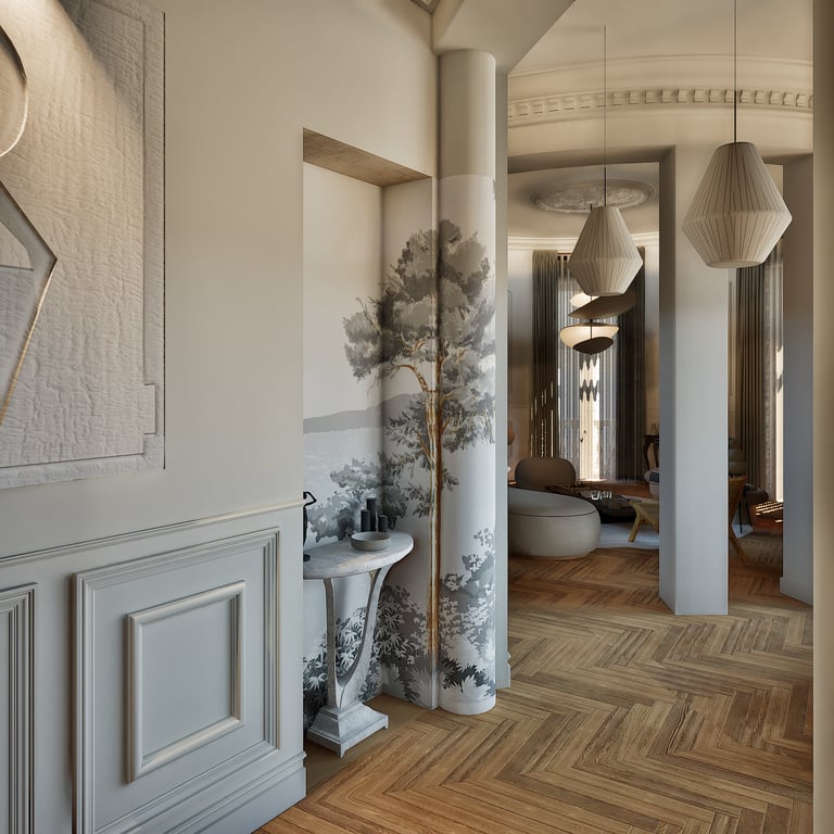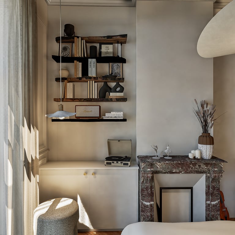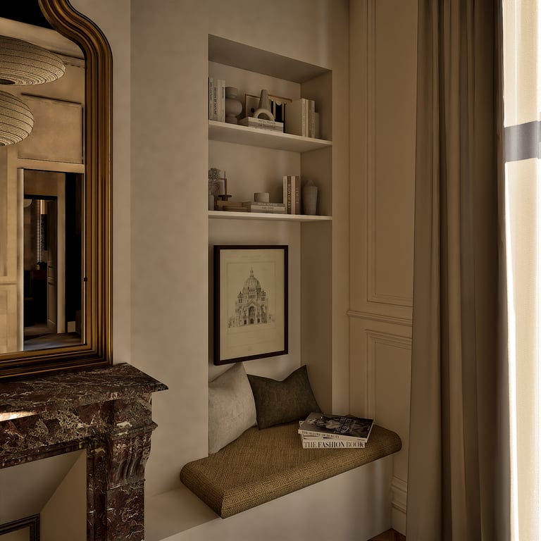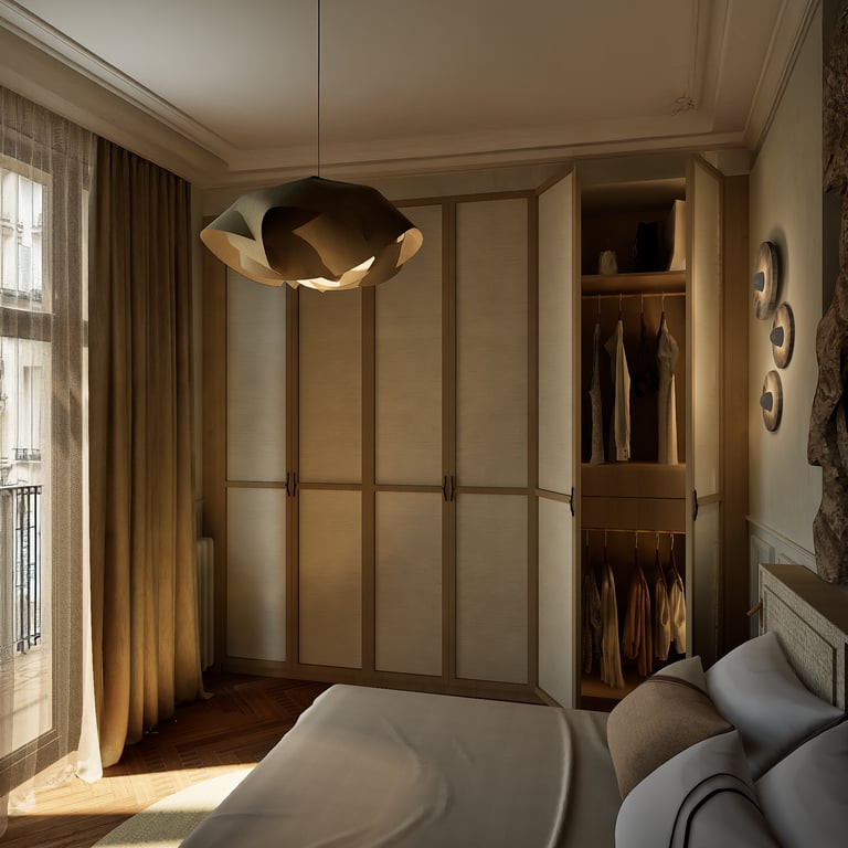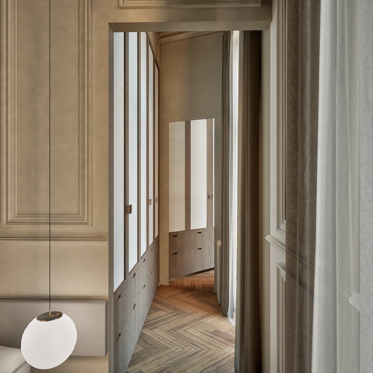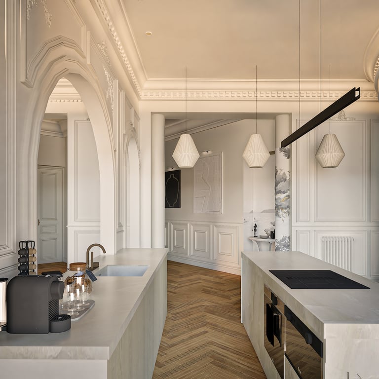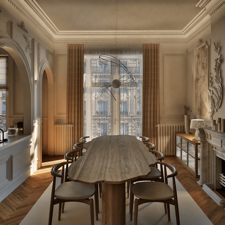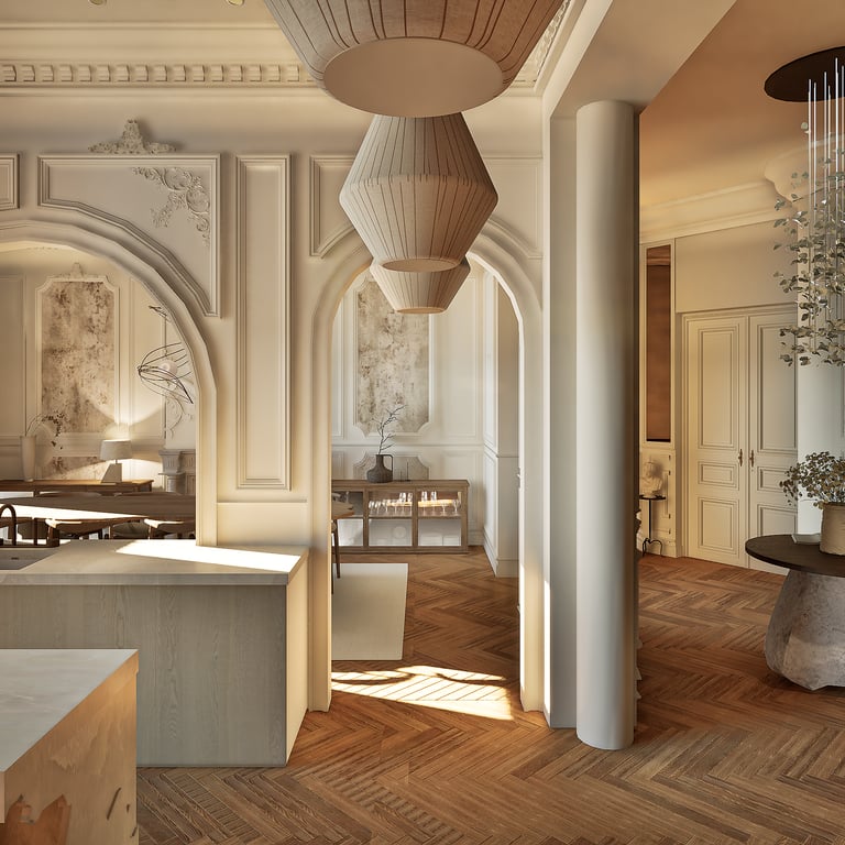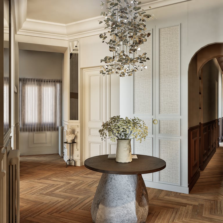 Ce projet reflète le charme haussmannien tout en harmonie avec le style wabi-sabi grâce à l'attention portée à chaque détails. De la réorganisation des pièces aux choix des matériaux des aménagements sur mesures, cet appartement de 184 m² est unique et créer un havre de paix en introduisant chaleureusement la nature de toute manière possible (matériaux, meubles, détails, quincaillerie, structure).